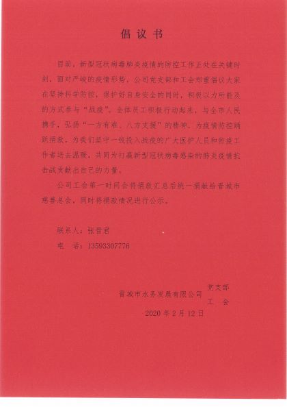 我公司黨支部成立“疫情防控志愿者服務(wù)隊(duì)”,配合公司所在社區(qū)進(jìn)行登記、管控、摸排等工作。不僅如此,公司黨支部和工會(huì)還聯(lián)合發(fā)出倡議書,鼓勵(lì)全體員工積極為一線抗疫捐款,員工們積極響應(yīng),紛紛踴躍捐款,截止目前我公司共收到員工捐款10100元,工會(huì)有關(guān)人員已第一時(shí)間將員工捐款匯總并送至慈善總會(huì)。