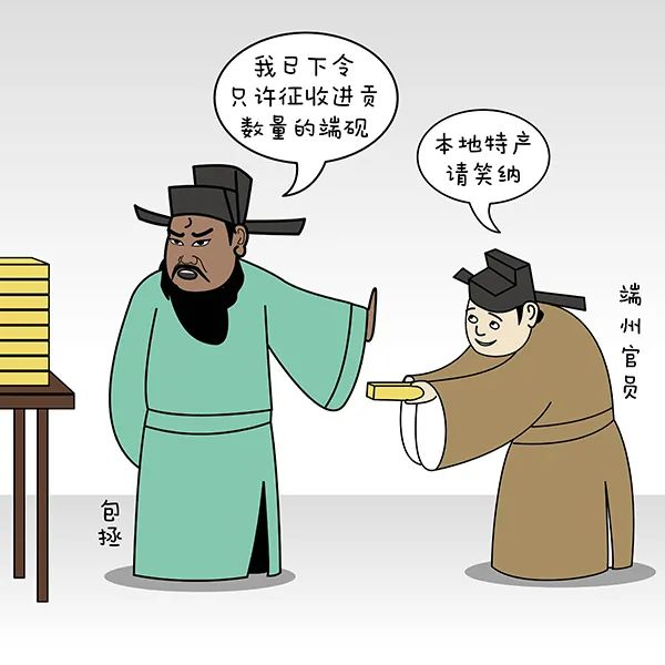 慶歷元年(1041年),包拯南下嶺南出任端州知府。端州自古以來以其端硯聞名于天下,為四大名硯之一,而當時端州官場潛規(guī)則很盛,以給朝廷進貢的名義征收數(shù)十倍的端硯來“孝敬”上級官員,以求來日上頭有人好做官。包拯到來,一心只為減輕百姓負擔,下令只許征收進貢數(shù)量的端硯,禁止多征一個,自斷歷來這條“升官捷徑”機會。包拯以身作則,任職3年,兩袖清風,“歲滿不持一硯歸”。